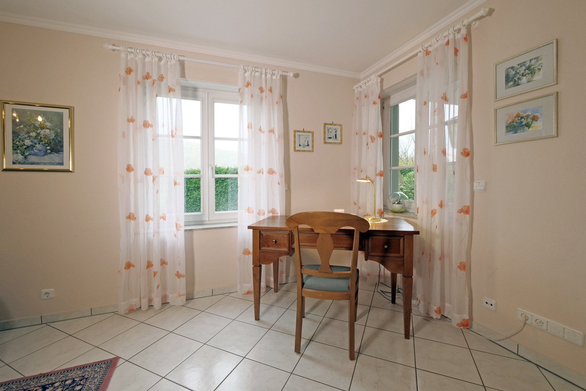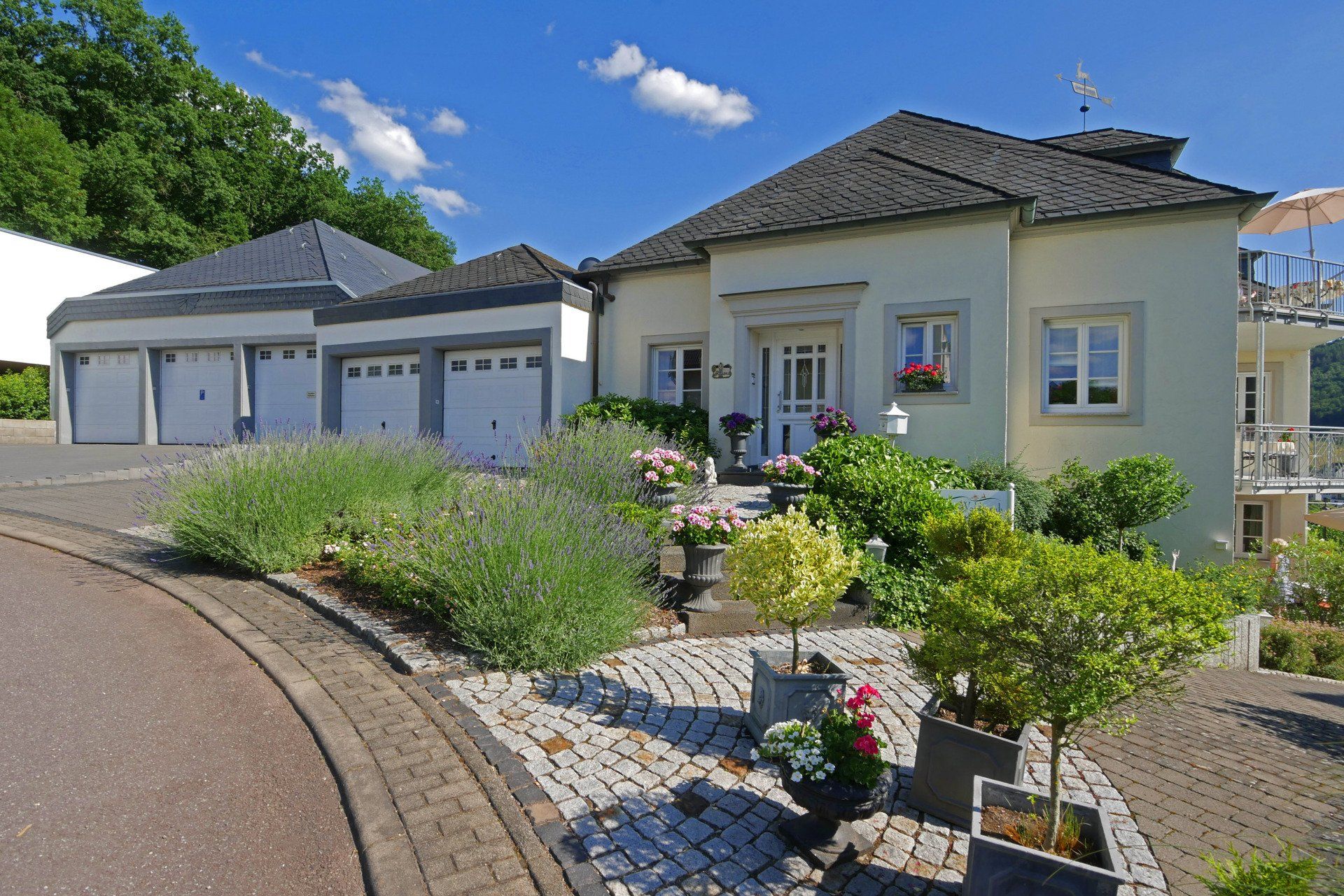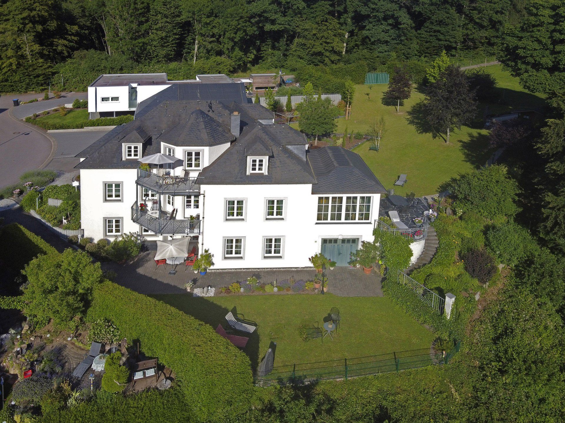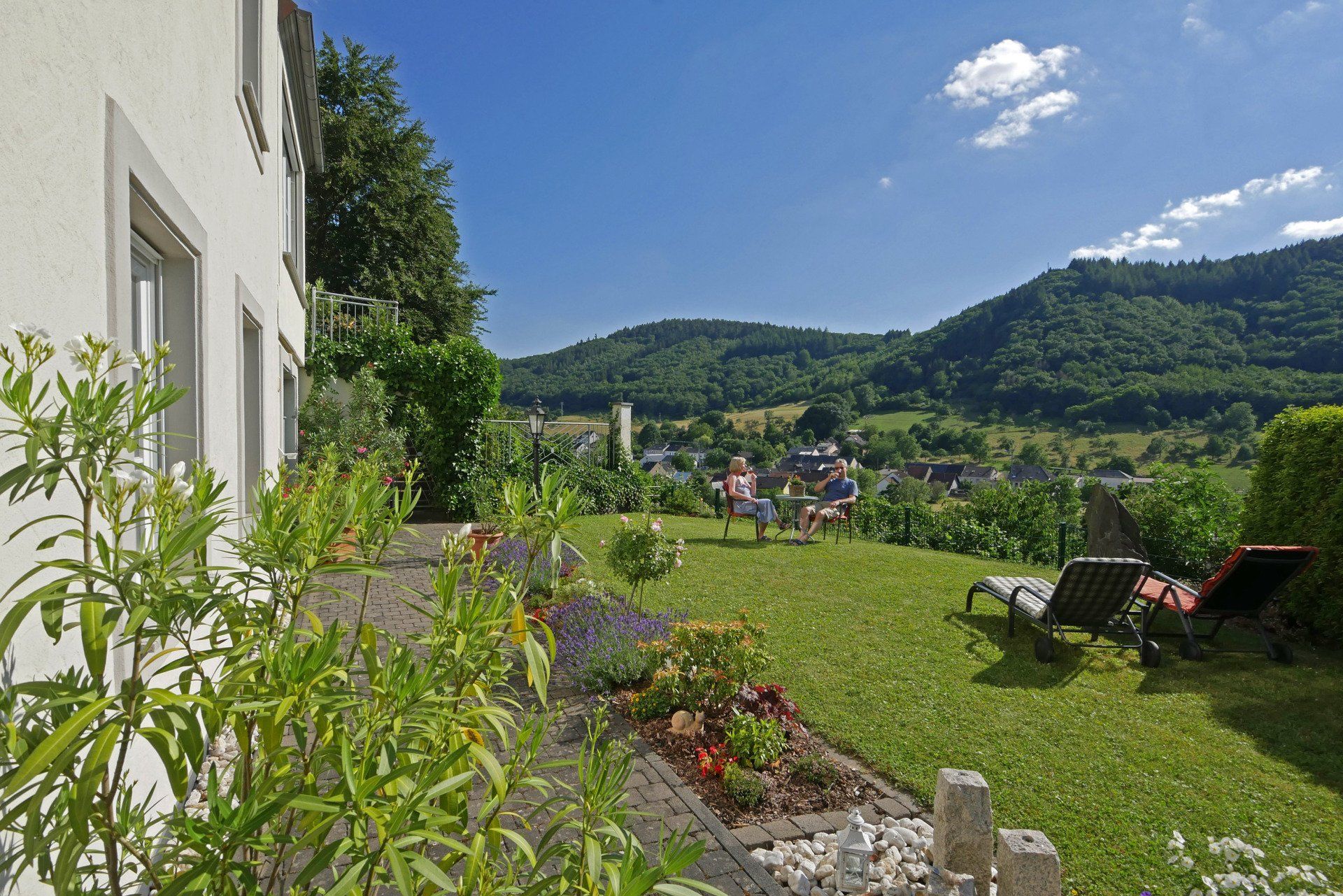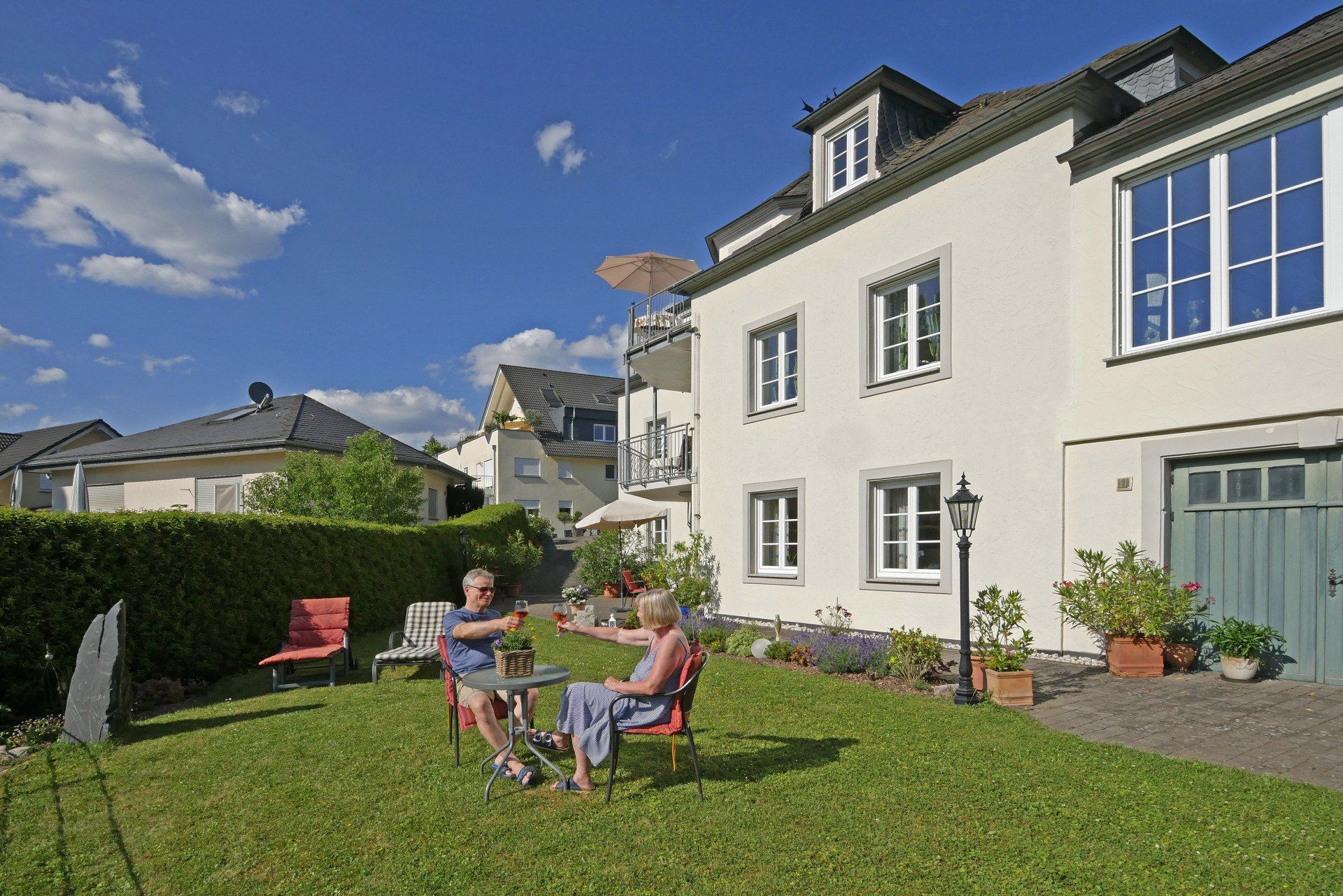 Unsere Nichtraucher-Wohnung im Erdgeschoss mit 118 qm Wohnfläche bietet bequem Platz für 4 Personen. Durch die stilvoll Diele gelangen Sie in das große Wohn- und Esszimmer. Zwei Doppelschlafzimmer mit Safe, davon ein Doppelzimmer mit Ankleidezimmer, schließen sich an. Das Bad mit WC und Urinal bietet eine Dusche mit Sitzgelegenheit und einen Haartrockner. Die große Einbauküche ist voll ausgestattet mit Spülmaschine und Mikrowelle. Auch ein Abstellraum mit Waschmaschine ist vorhanden. Von der Terrasse mit Liegewiese genießen Sie den Blick ins Saartal und auf Saarburg.